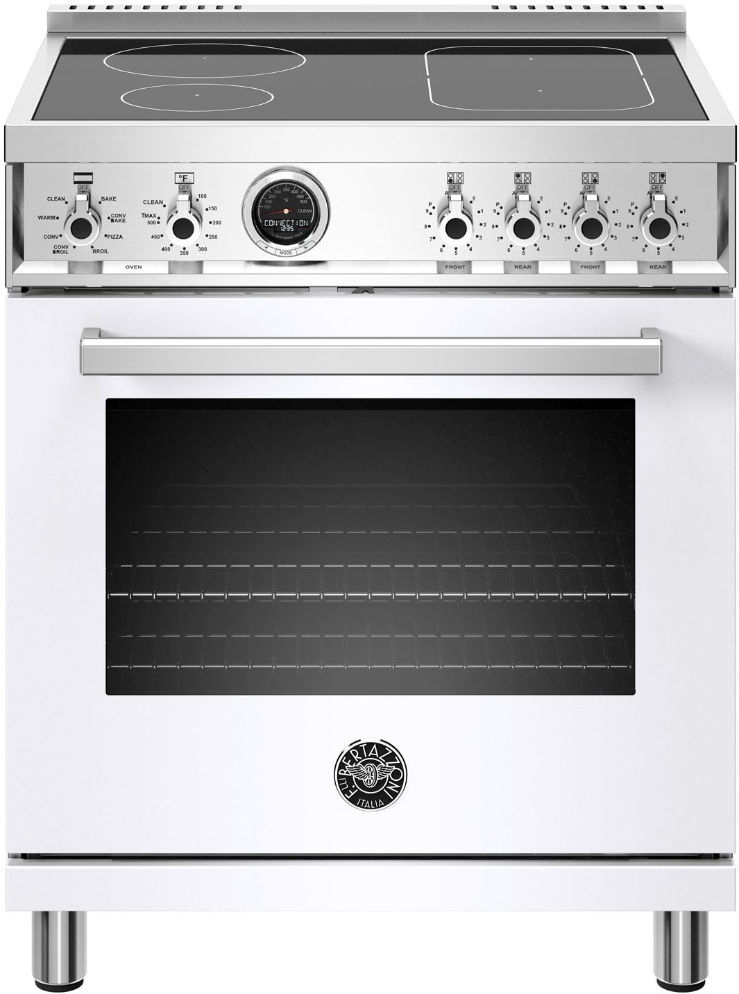The new Bertazzoni ranges are superb cooking appliances designed, engineered and made in Italy. All Bertazzoni appliances integrate seamlessly into style-harmonized suites for a true, high-performing kitchen. This all-new induction range has 4 high-power heating zones with maximum power output of 3700W. The right-side heating zones can be bridged to create a larger cooking area. Each induction area is controlled with knobs and has a convenient read-out interface on the glass worktop. The 4.6 cubic feet oven cavity is the largest in its class, with dual convection fan for balanced airflow and even temperature baking and roasting on 7 shelf levels. The elegant digital temperature gauge monitors the actual temperature in the oven and has integrated controls in the bezel for the food temperature probe. The extra wide electric broiler with optional convection is ideal for grilling and searing at high heat. The oven includes convenient features such as smooth telescopic glides for the oven shelves and soft-close doors. The edge-to-edge interior oven glass door maximizes interior volume and can be wiped clean without effort. All Bertazzoni appliances are covered by a 2-year warranty. Products and packaging are 99% recyclable.