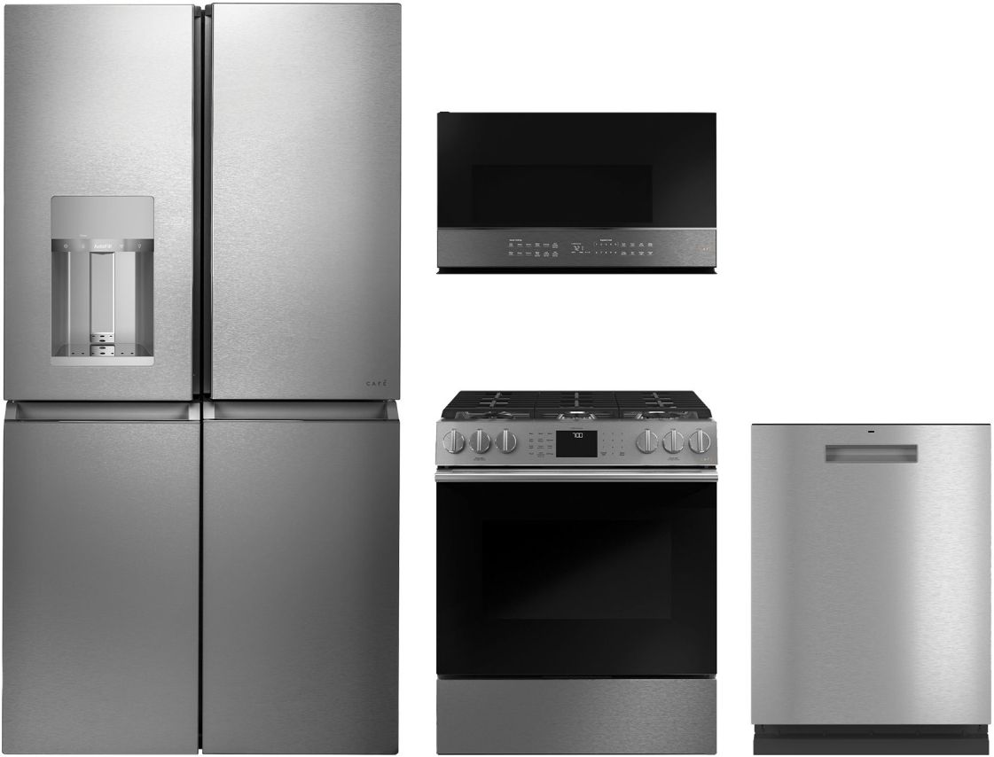 Café™ 4 Piece Stainless Steel Kitchen Package with a french door refrigerator, slide in gas range, built in dishwasher and over the range microwaveRead More