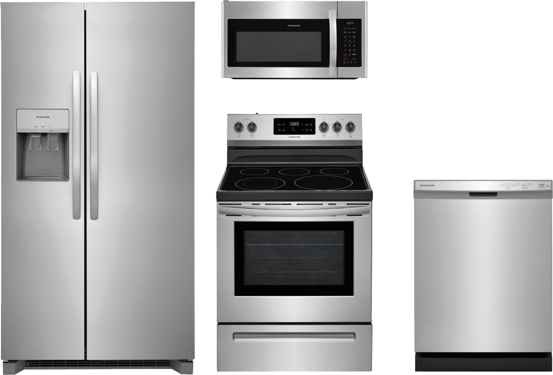 Frigidaire® 4 Piece Kitchen Package-Stainless Steel with Side-by-Side Refrigerator, Freestanding Electric Range, Built In Dishwasher, and Over The Range Microwave.Read More