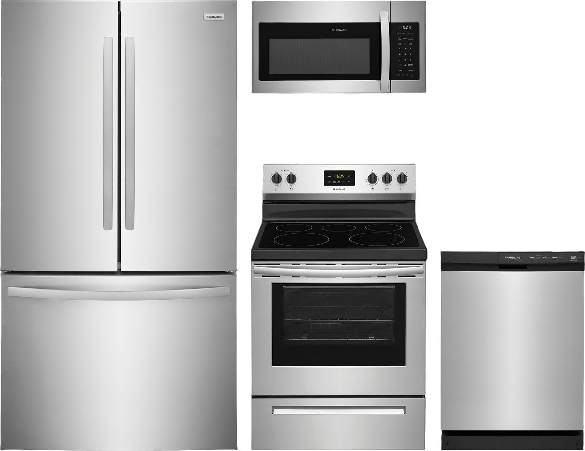 Frigidaire® 4 Piece Stainless Steel Kitchen Package with French door refrigerator, freestanding electric range, built in dishwasher and over the range microwave.Read More