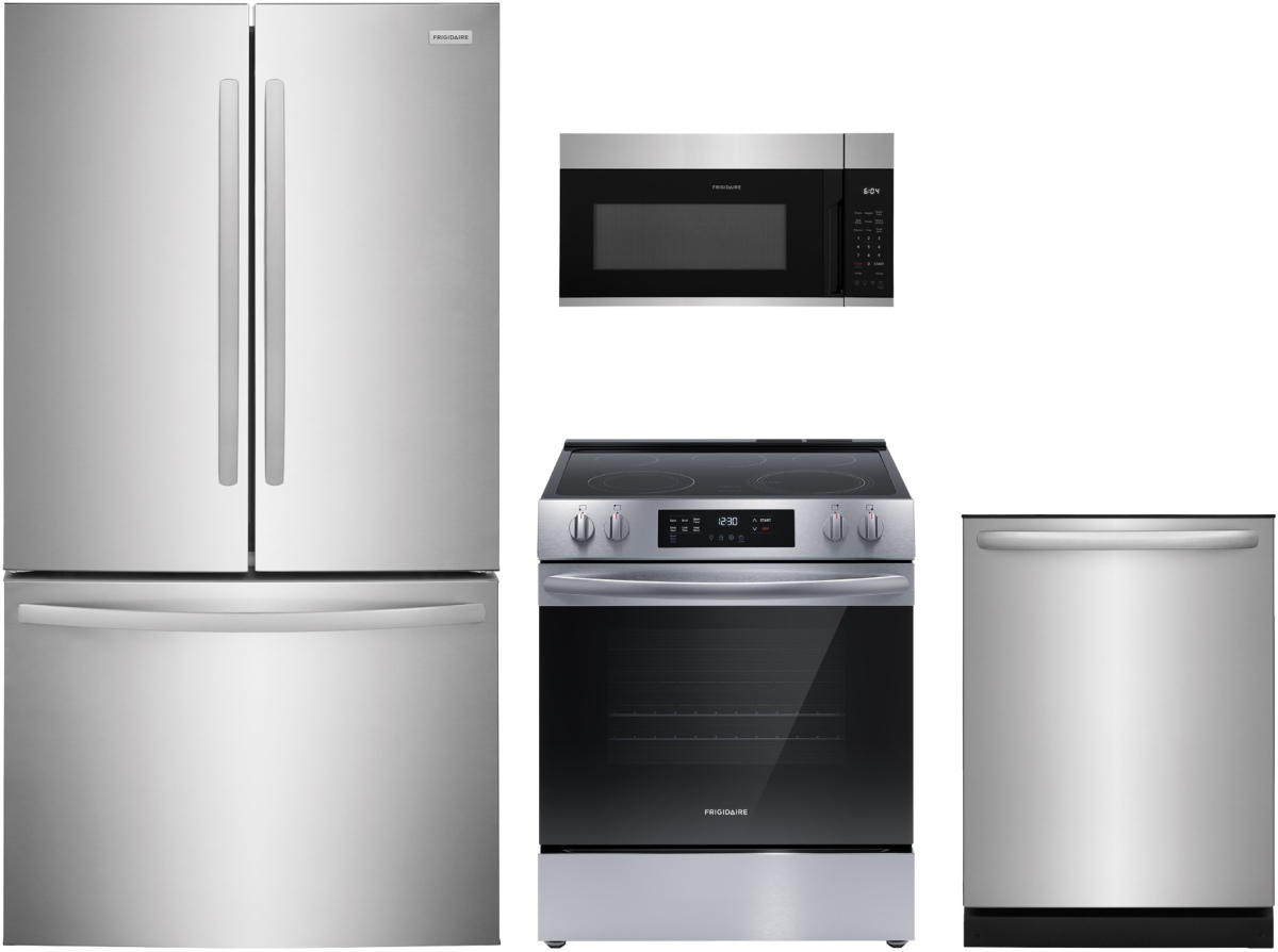Frigidaire® 4 Piece Stainless Steel Kitchen Package with French door refrigerator, freestanding electric range, built in dishwasher and over the range microwave.Read More