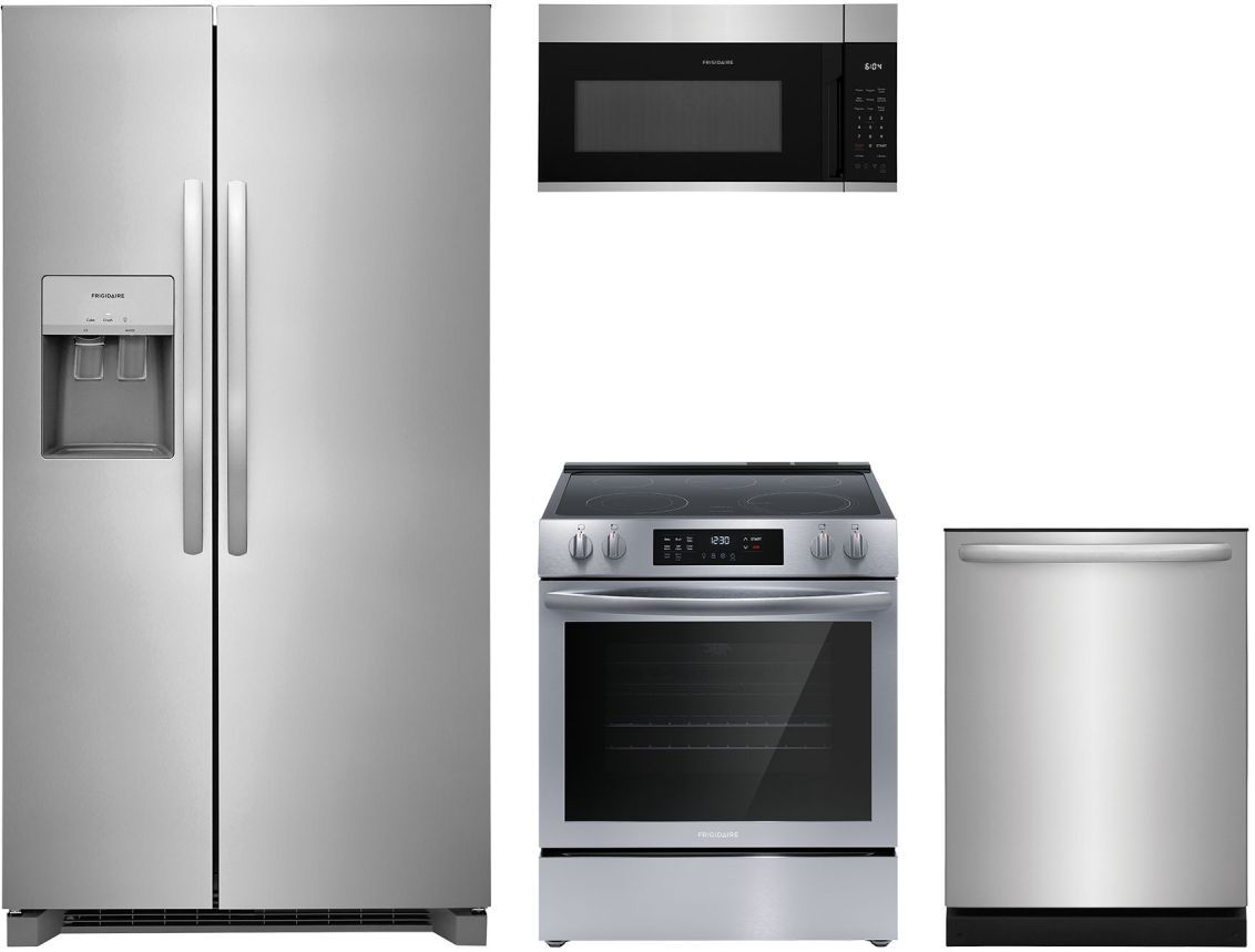 Frigidaire® 4 Piece Stainless Steel Kitchen Package with Side-by-Side Refrigerator, Freestanding Electric Range, Built In Dishwasher, and Over The Range Microwave.Read More