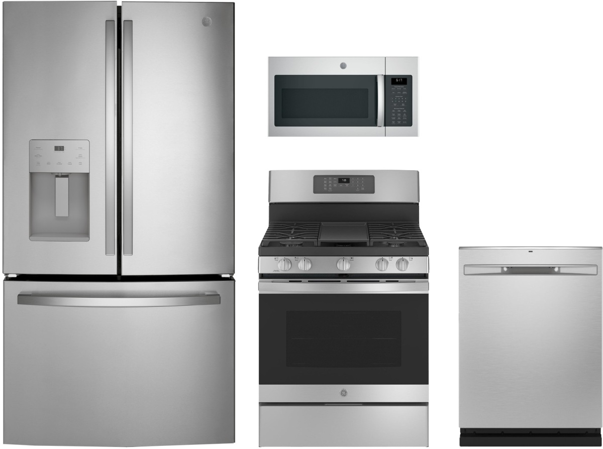 GE® 4 Piece Stainless Steel Kitchen Package with French door refrigerator, freestanding gas range, built in dishwasher, and over the range microwave.Read More
