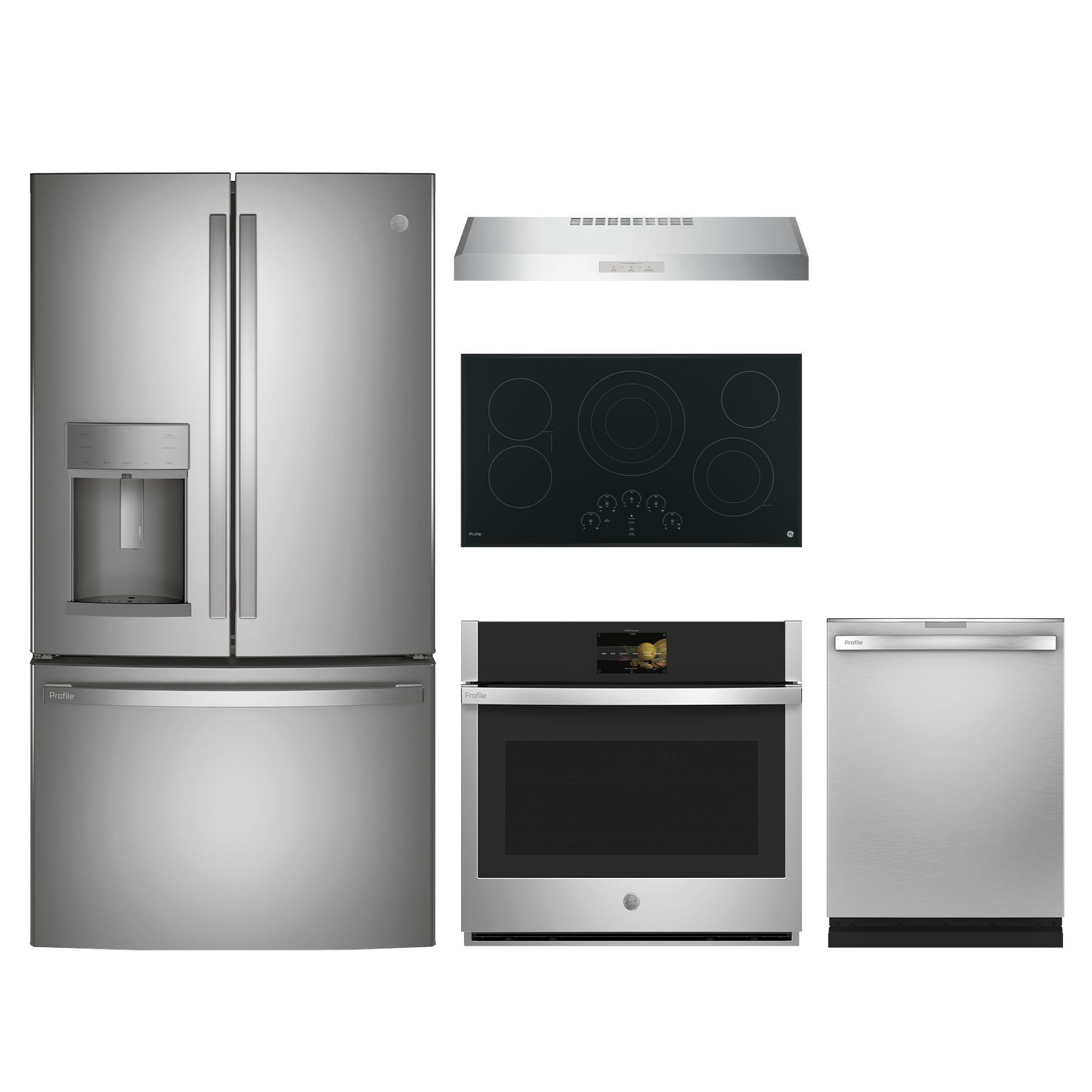 GE Profile™ 5 Piece Kitchen Package with a french door refrigerator, electric cooktop, single wall oven, built in dishwasher, and range hoodRead More