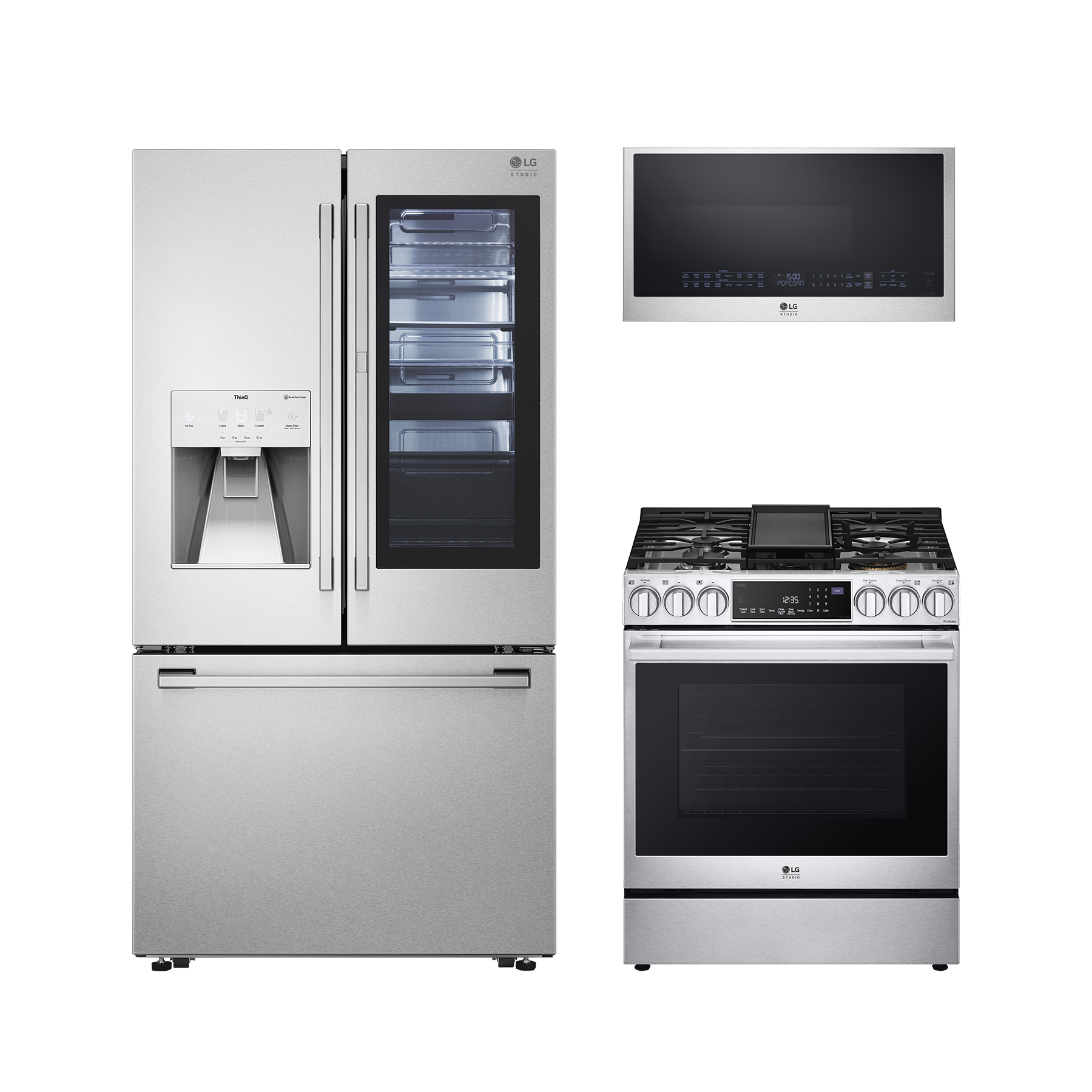 LG 3 Piece Stainless Steel Kitchen Package with a 23.5 cu. ft. counter-depth french door refrigerator, slide in natural gas range, and over the range microwave.Read More