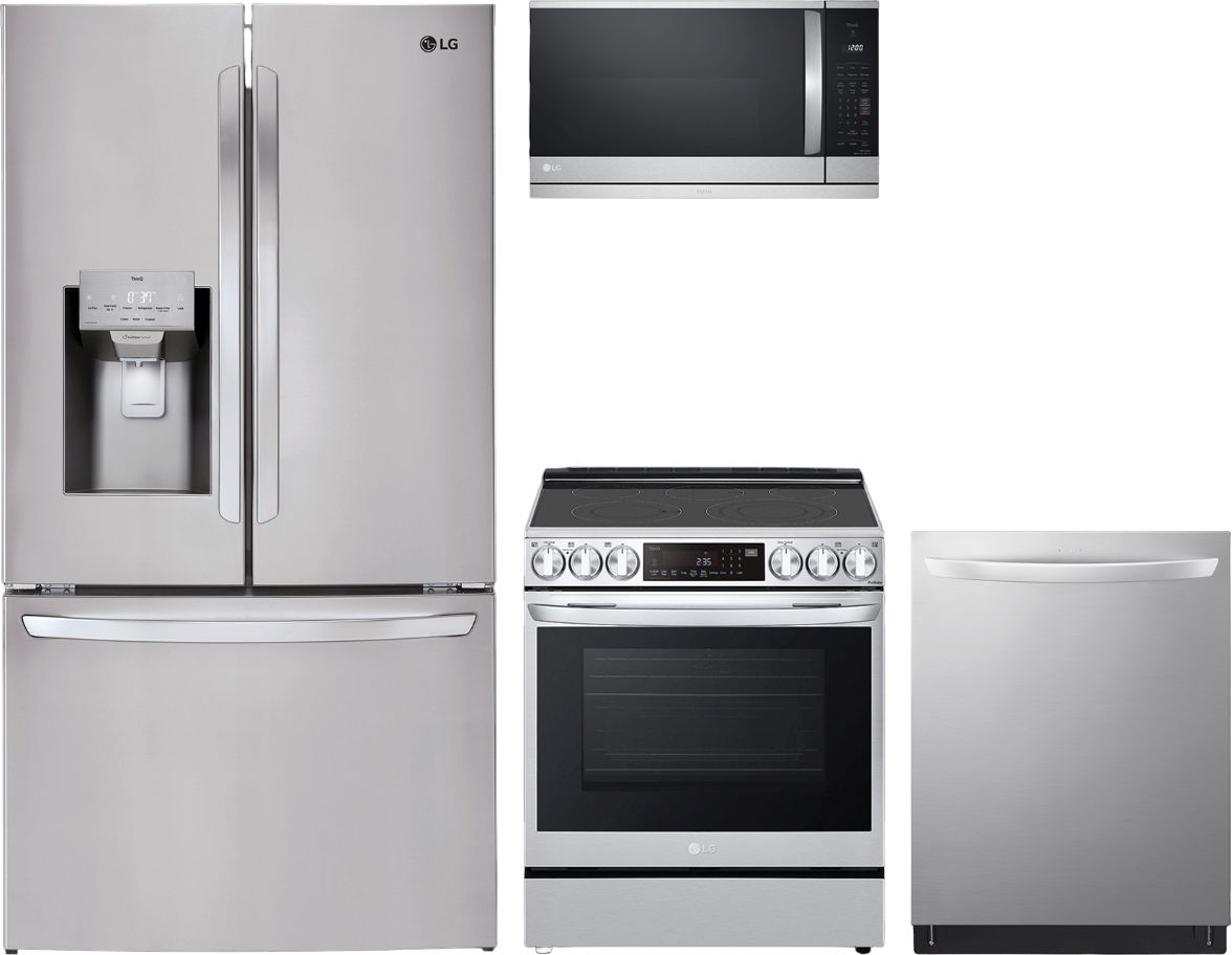LG 4 Piece PrintProof™ Stainless Steel Kitchen Package with French door refrigerator, slide in electric range, built in dishwasher, and over the range microwave.Read More