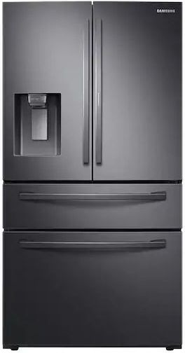 A 22 cu. ft. 4-Door French Door refrigerator in a black stainless steel finish. Our counter-depth design brings a seamless built-in look to your kitchen, while the Food Showcase capability provides easy access to on-the-go items. Wi-Fi and Bixby enabled with a FlexZone drawer that offers four different temperature settings and a smart divider.Read More