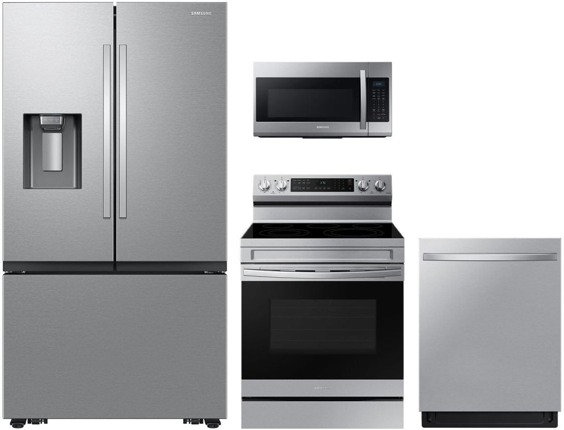 Samsung 4 Piece Stainless Steel Kitchen Package with a counter depth french door refrigerator, free standing electric range, built in dishwasher and over the range microwaveRead More
