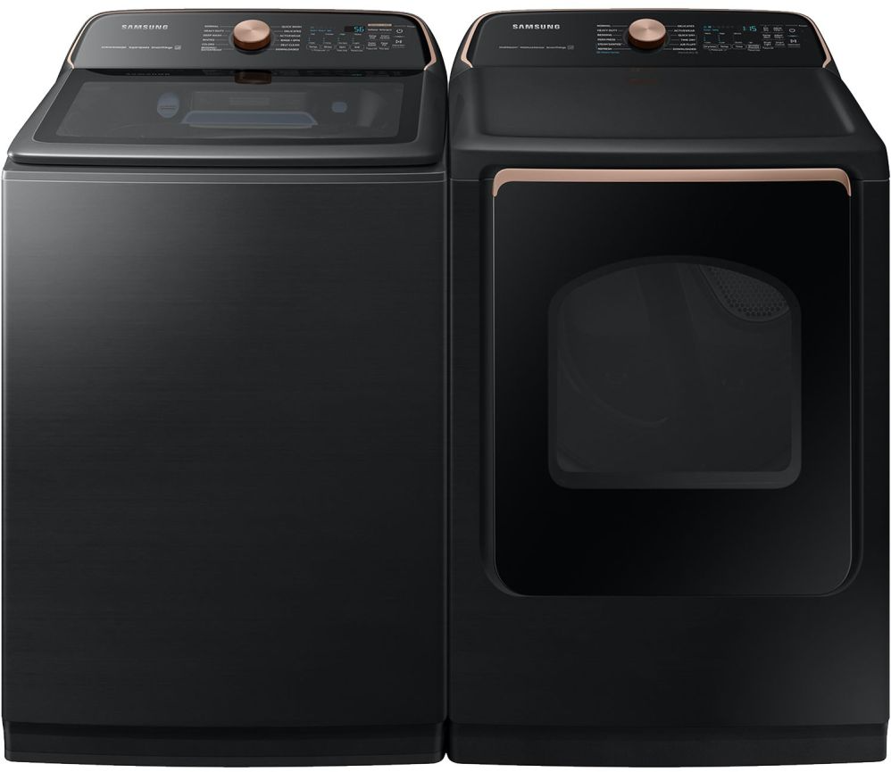 Samsung Brushed Black Laundry Pair with a 5.5 cu. ft. capacity top load washer and a 7.4 cu. ft. capacity front load gas dryer.Read More