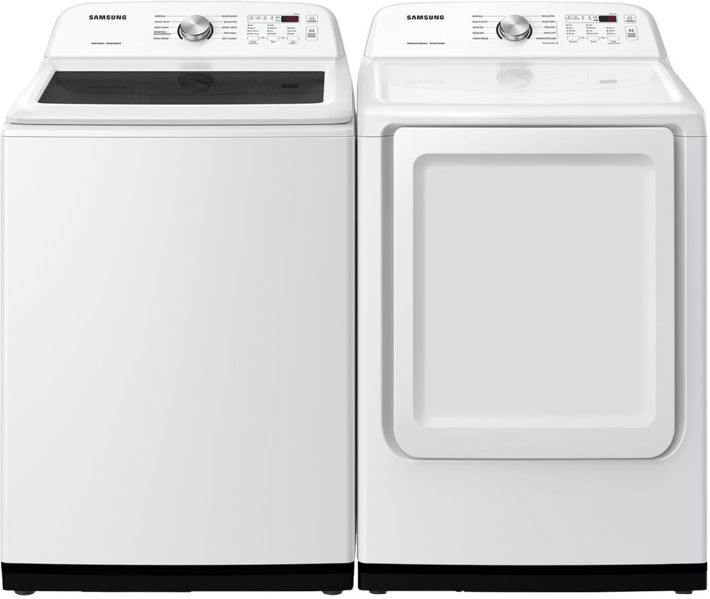 Samsung White Laundry Pair with a 5.0 cu. ft. capacity top load washer and 7.4 cu. ft. capacity front load gas dryerRead More