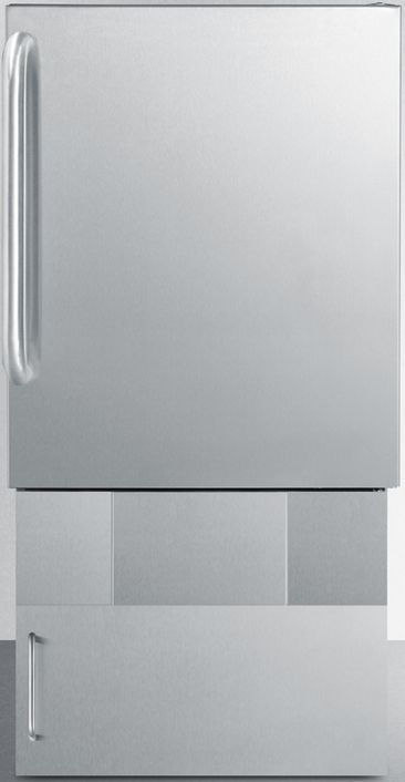 SUMMIT brings a convenient freeze to the outdoors with the BIM24OSBase34, a compact icemaker with U.L. approval for outdoor use. Fully wrapped in 304 grade stainless steel, the BIM24OSBase34 is designed to stand up to nature with elegant style. The weatherproof design includes a completely sealed back that protects all electrical components and SUMMIT's integrated Ground Fault Circuit Interrupter (GFCI) adds an extra level of protection and automatically resets the unit in the event of power failure. The BIM24OSBase34 is designed for built-in installation under counters but can also function freestanding. It is mounted on a lower base that raises the unit height to be adjustable between 33" and 34 ¾" high. This stainless steel cabinet offers convenient options for storing icemaker accessories and other outdoor utensils inside the drawer. The BIM24OSBase34 can produce and store up to 12 pounds of crescent shaped cubes in a day cycle, with a carefully insulated storage bin. Operation does not require a drain. Our signature 12" towel bar handle completes the package.