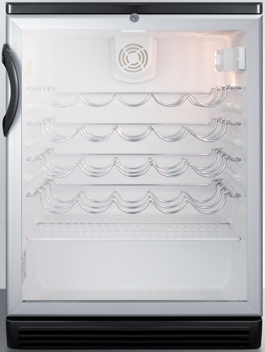 SUMMIT SWC6GBI series features European designed, commercially approved wine cellars capable of built-in use under counters. The SWC6GBLBI is conveniently sized at just 24" wide, with a front-breathing design for built-in installation under counters. The fully finished black cabinet also allows freestanding use. This unit features a user-reversible double pane tempered glass door for reliable storage. The lock is located towards the top of the door for easier access. Inside, the SWC6GBLBI includes adjustable scalloped shelves perfectly designed to hold bottles in place. The white interior helps to improve visibility, letting your collection stand out clearly. This unit includes an interior light with an on/off rocker switch located behind the adjustable dial thermostat. The SWC6GBLBI is made in Europe and is ETL-S listed to NSF-7 standards for commercial use. Additional handle styles and door tint options are avialable. NOTE: These models are designed primarily for white wine storage but can be upgraded with a digital thermostat to accommodate red wine temperatures.