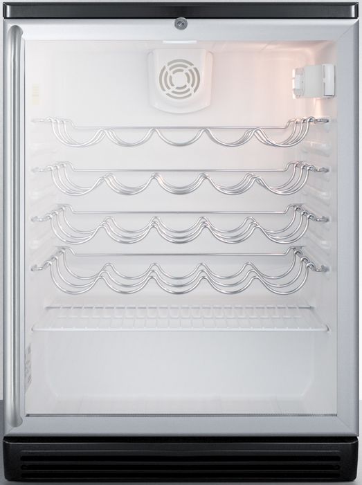 SUMMIT SWC6GBI series features European designed, commercially approved wine cellars capable of built-in use under counters. The SWC6GBLBISH is conveniently sized at just 24" wide, with a front-breathing design for built-in installation under counters. The fully finished black cabinet also allows freestanding use. This unit features a double pane tempered glass door for reliable storage. We include a full-length towel bar style handle in brushed stainless steel to complete the professional look. The lock is located towards the top of the door for easier access. Inside, the SWC6GBLBISH includes adjustable scalloped shelves perfectly designed to hold bottles in place. The white interior helps to improve visibility, letting your collection stand out clearly. This unit includes an interior light with an on/off rocker switch located behind the adjustable dial thermostat. The SWC6GBLBISH is made in Europe and is ETL-S listed to NSF-7 standards for commercial use. Additional handle styles and door tint options are available. NOTE: These models are designed primarily for white wine storage but can be upgraded with a digital thermostat to accommodate red wine temperatures.