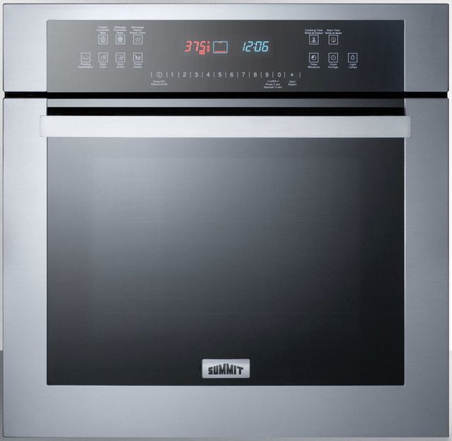 Summit lets you complete smaller kitchen spaces in style with fully featured electric wall ovens specially sized for 24" openings. Made in North America, the SEW24SS is a 220V electric wall oven for built-in installation in 23 3/16" H x 22 3/16" W x 25" D cutouts. Brushed stainless steel trim and a black glass window and control panel create a modern look, with a professional handle for added style. Inside, the SEW24SS includes an oven light for easier monitoring of your cooking. This unit is equipped with a steam clean function that offers a more efficient, faster solution to keeping the porcelain interior clean from new spills and soils. Two heavy duty gliding racks with brakes can sit on five rack positions to better accommodate different sized dishes. We include a two-piece broiler tray with lid for added convenience, as well as a meat probe that can be plugged into the oven and programmed and monitored through the oven's own control panel. The SEW24SS offers a range of heating functions to cover virtually all of your cooking needs. The digital control panel is easy to program, with specialty settings for baking, broiling, convection baking, and convection roasting. The proofing setting is perfect for using lower heat to activate yeast when making bread. Touch controls let you set the time and heat levels as you need. An audible timer sounds to alert when your program is finished. Safety features include an automatic shutdown (12 hours for bake function, 3 for broil), which can be disabled if needed. Additional programming options allow you to set a child lock or control lockout. There is also a Sabbath mode that can be used with the baking and roasting functions. All controls are shown in English and Spanish for added convenience. Temperature is set to Fahrenheit but can be displayed in Celsius with a few simple steps. This unit includes a digital display of the time (standard 12-hour or military 24-hour), oven temperature, and which mode the oven is in. The display can be blacked out if you prefer to disable all lighting. With its advanced features, modern style, and ideal size, the SEW24SS is the perfect choice for space-challenged kitchens looking to maintain full cooking capacity in a slimmer footprint. Additional choices for wall ovens, cooktops, and ranges are available in Summit's extensive product line.