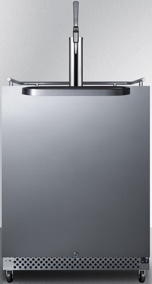 The SBC696OSNCF is a full-sized weatherproof kegerator designed to serve nitro-infused coffee on tap. It is ETL-S listed to NSF-7 standards and meets UL-471 for commercial applications.This unit comes with a jet black cabinet and stainless steel wrapped door, with a sealed back designed to protect all electrical components from the elements. It features a front-breathing system that allows built-in installation under counters, as well as a fully finished exterior for optional freestanding use. A caster set is included for optional mobility, along with a durable top rail guard. The user-reversible stainless steel door is self-closing to ensure your kegs aren't accidentally exposed to warmer temperature, with an audible alarm that warns if the door is left open for over one minute. This unit includes a stainless steel kickplate and horizontally mounted handle in a sleek blade shape, ideal for matching many popular styles of grills and cabinetry. A factory-installed front lock offers added security.