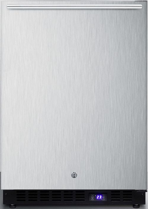 SUMMIT SPFF51OS Series features versatile frost-free all-freezers perfectly sized and featured for convenient use in outdoor spaces. The SPFF51OSCSSHHIM is a 24" wide all-freezer designed for built-in or freestanding use. The cabinet and door are fully wrapped in 304 grade stainless steel to hold up to the outdoor elements. The reversible door includes a factory installed lock for added security and a thin stainless steel handle mounted horizontally for a modern look. Inside, the SPFF51OSCSSHHIM is designed for true convenience and low maintenance operation. The frost-free design ensures users won't have to manually defrost the 4.72 cu.ft. interior, while adjustable shelves offer flexible storage solutions. Recessed LED lighting provides an attractive, energy efficient display. A digital thermostat (located in the unit's kickplate) makes temperature management easy and intuitive and a factory installed icemaker offers added convenience. With solid construction and a striking design, the SPFF51OSCSSHHIM makes an ideal finish for any outdoor kitchen. For a matching refrigerator, see the SPR627OSCSSHH.