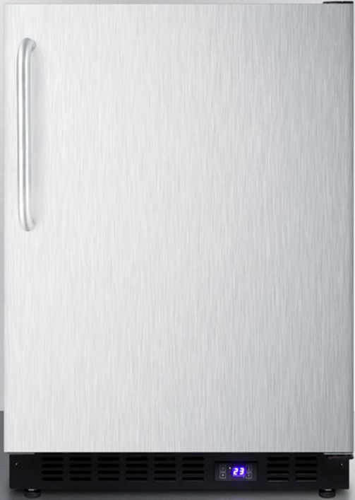 SUMMIT's SCFF53B Series brings quality and convenience under the counter with a fully featured lineup of built-in frost-free all-freezers. Sized with a convenient 24" footprint, the SCFF53BXSSTBIM freezer can be used built-in or freestanding. It has a black cabinet and sealed back for easy cleaning. The stainless steel wrapped door includes our signature towel bar handle to complete the professional look. Inside, the SCFF53BXSSTBIM utilizes frost-free operation with fan-forced cooling to ensure low maintenance and even temperature distribution. Recessed LED lighting offers an attractive yet efficient look. The digital thermostat makes it easy to manage the interior temperature. This unit includes adjustable chrome shelves for flexible storage and a factory installed icemaker. Additional features include an open door alarm, high temperature alarm, and Sabbath mode setting that lets you disable some of the electrical elements during periods of observance. With its deluxe style and user-friendly features, the SCFF53BXSSTBIM is the perfect choice for home or commercial kitchens. For a matching frost-free all-refrigerator, see the FF64BXSSTB.