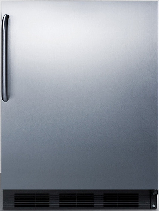 Sized with a 24” footprint, the CT663BKBISSTBADA refrigerator-freezer offers a generous 5.1 cu.ft. storage capacity, larger than many units in this size class. The 32” height and front-breathing design makes it ideal for installation under lower counters complying with ADA guidelines for height restriction. The fully finished cabinet also enables freestanding use. This unit comes with a black cabinet and stainless steel wrapped door. A curved towel bar handle in brushed stainless steel completes the professional look.
