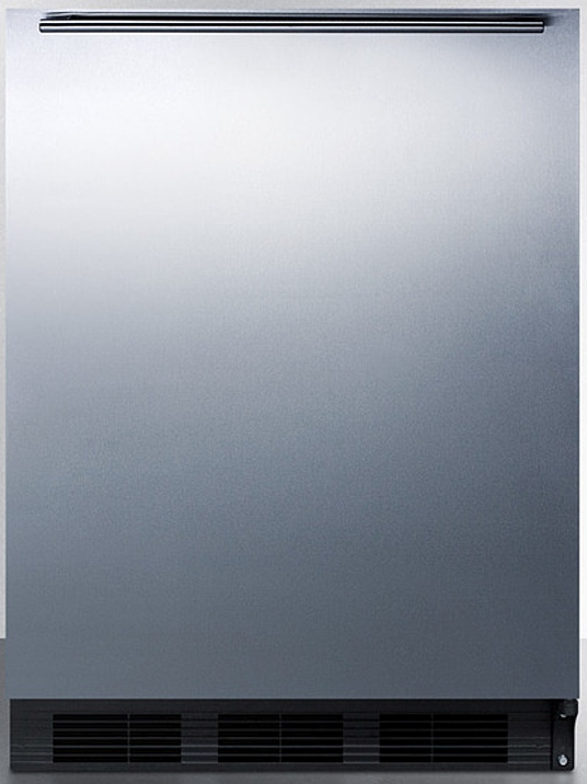 Sized with a 24” footprint, the FF63BKBISSHH is front-breathing for built-in use. The fully finished cabinet also allows freestanding use for added versatility. This model comes with a black cabinet and reversible stainless steel wrapped door. A thin handle with a 14mm diameter is mounted horizontally for a sleek, modern look. Designed and constructed in Europe, the FF63BKBISSHH refrigerator offers reliable cold storage for any home looking to install a quality all-refrigerator under the counter.
