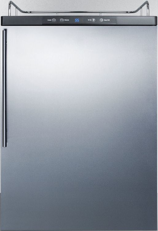 Summit Appliance offers a versatile line of full-sized built-in beer dispensers designed for low maintenance storage in the style of your choice. The SBC635MBINKSSHV features a large interior that can hold a full half, quarter, 0.17" or mini keg. No tapping equipment is included, allowing 'do-it-yourselfers' to customize the unit with their own system. It features a front-breathing design for built-in installation under counters. The stainless steel wrapped door comes with a sleek vertically mounted handle that matches many popular styles of cabinetry. The surface includes a removable drip tray to collect spills and a chrome guard rail to help keep glasses and mugs in place. The user-reversible door swing makes it easy to accommodate any location’s setup. This unit is height adjustable from 33.50" to 34" to best fit your undercounter space. Please note that the door does not open in its own radius. When planning your cutout, if the unit is mounted against a wall or flush under cabinetry, you will need between 25 and 25.25" width for proper ventilation. Automatic defrost operation ensures minimum user maintenance inside the 5.6 cu.ft. interior. A digital thermostat makes it easy to manage the temperature at the touch of a button. The external digital display shows the temperature in Celsius or Fahrenheit to ensure your beer is stored exactly how you like it. The floor is reinforced with a steel cover for added durability when loading kegs. For more style options, browse the full SBC635MBI Series.