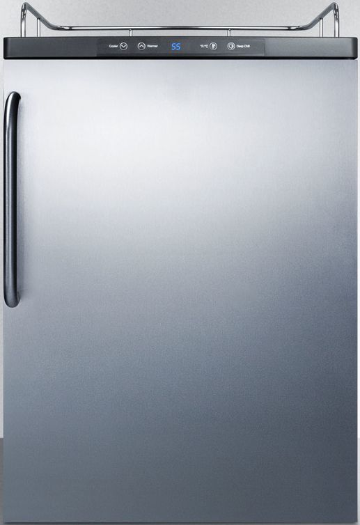 Summit Appliance offers a versatile line of full-sized built-in beer dispensers designed for low maintenance storage in the style of your choice. The SBC635MBINKSSTB features a large interior that can hold a full half, quarter, 0.17" or mini keg. No tapping equipment is included, allowing 'do-it-yourselfers' to customize the unit with their own system. It features a front-breathing design for built-in installation under counters. The stainless steel wrapped door comes with a curved towel bar handle for a professional look. The surface includes a removable drip tray to collect spills and a chrome guard rail to help keep glasses and mugs in place. This unit is height adjustable from 33.50" to 34" to best fit your undercounter space. Please note that the door does not open in its own radius. When planning your cutout, if the unit is mounted against a wall or flush under cabinetry, you will need between 25 and 25.25" width for proper ventilation. Automatic defrost operation ensures minimum user maintenance inside the 5.6 cu.ft. interior. A digital thermostat makes it easy to manage the temperature at the touch of a button. The external digital display shows the temperature in Celsius or Fahrenheit to ensure your beer is stored exactly how you like it. The floor is reinforced with a steel cover for added durability when loading kegs. For more style options, browse the full SBC635MBI Series.