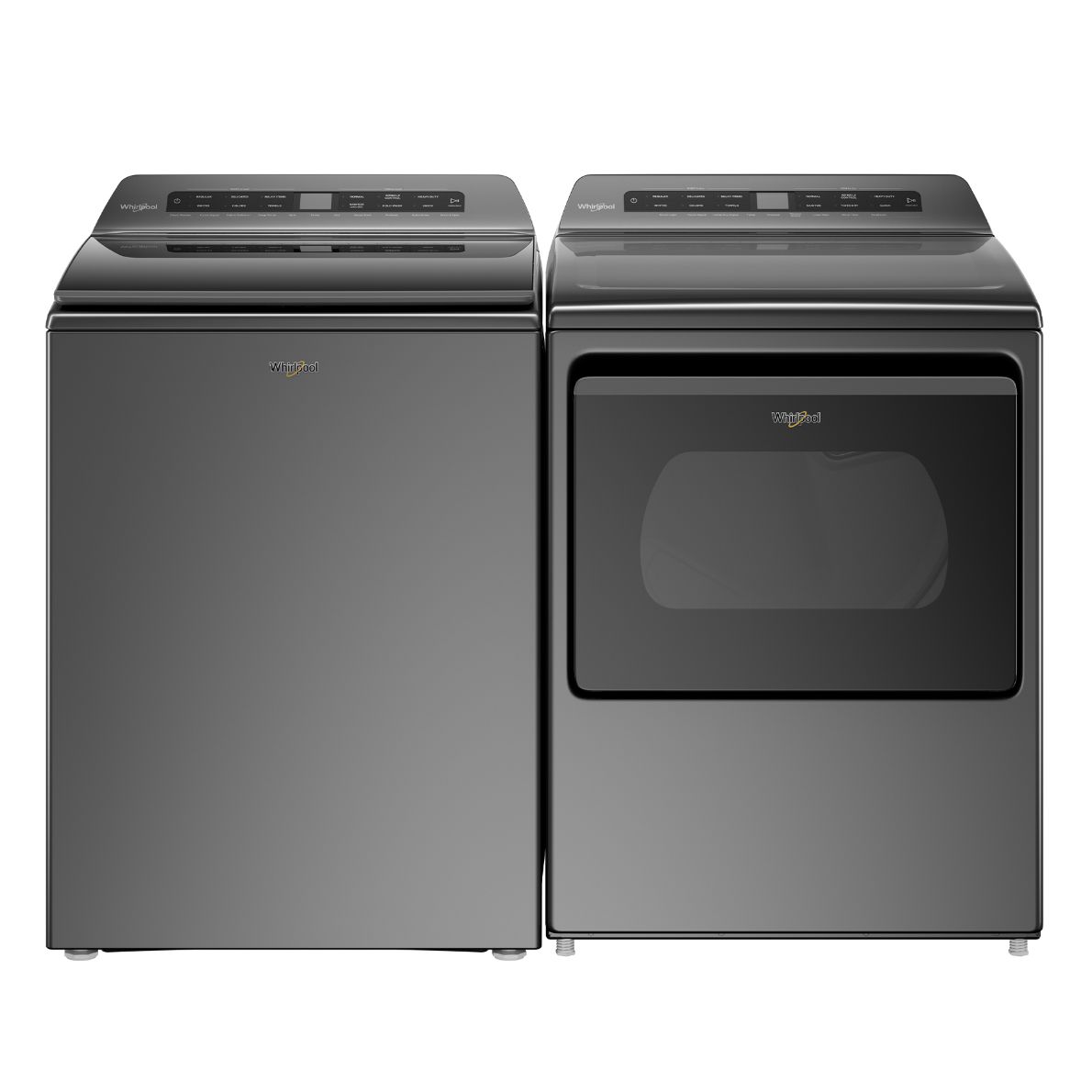Whirlpool® Chrome Shadow Laundry Pair with a 4.8 cu. ft. capacity top load washer and a 7.4 cu. ft. capacity front load gas dryer.Read More